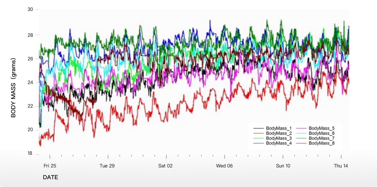 您可分析實驗中測量到的每個指標(biāo)的比較趨勢,包括活動量、攝食量或能量消耗。實驗結(jié)果全程可見,不再是等到實驗結(jié)束后才可獲得。Promethion Live實時提供分組數(shù)據(jù)的均值或中位數(shù)以便數(shù)據(jù)對比。數(shù)據(jù)可實時顯示或?qū)С鲇糜谶M一步分析。